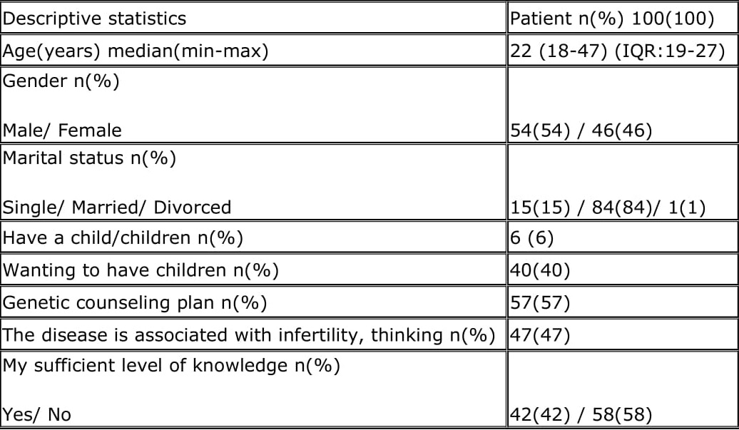 In conclusion, a significant proportion of patients did not have sufficient knowledge about the effects of the disease on reproductive health, and this situation was also reflected in the attitudes and behaviors of the patients. It was interesting that the majority of male patients did not accept to have spermiogram and scrotal USG examinations. It has been observed that adult patients should be informed about the effects of the disease on reproductive health and should receive genetic counseling.