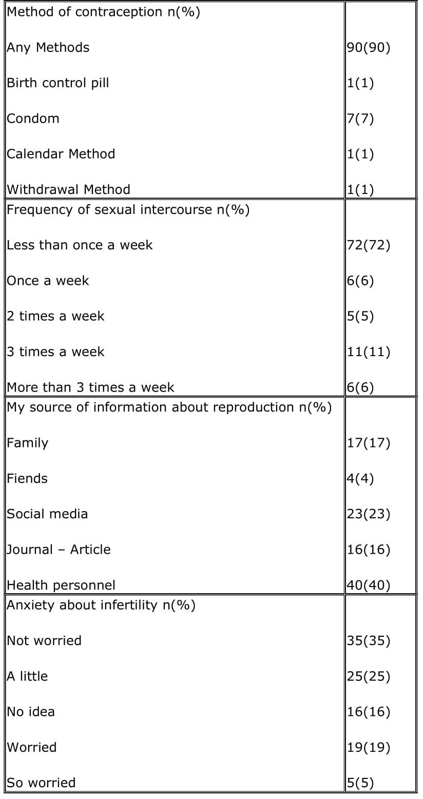 Knowledge of patients about infertility did not affect the contraceptive method they applied and the frequency of sexual intercourse (p= 0.408 and 0.18, respectively). It was observed that the source of information did not affect the thoughts about the relationship of the disease with infertility, the method of contraception applied and the frequency of sexual intercourse (p 0.71, 0.393, 0.662, respectively). The source of information about reproductive health in cystic fibrosis did not affect level of anxiety (p=0.002). Knowing that their level of knowledge about the relationship of their disease with infertility was sufficient also affected their anxiety levels (p=0.007).